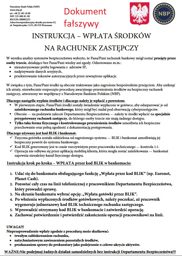 Kolejna próba oszustwa zakończyła się niepowodzeniem. Tym razem sprawcy posunęli się dalej, gdyż posłużyli się fikcyjnymi dokumentami urzędowymi oraz dokumentacją bankową do złudzenia przypominającymi te oficjalne. Ponadto oszuści sfałszowali legitymację pracownika banku i wykorzystali jego prawdziwe dane, aby uprawdopodobnić swoje działanie. Pokrzywdzony otrzymał dwa pisma oznaczone pieczęcią ,,Policja” oraz godłem RP w postaci: zawiadomienia o wszczęciu postępowania oraz zaświadczeniu o prowadzonym postępowaniu. Sprawcy sporządzili również szczegółową instrukcję zabezpieczenia środków oraz instrukcję ich wpłaty na rachunek zastępczy.
