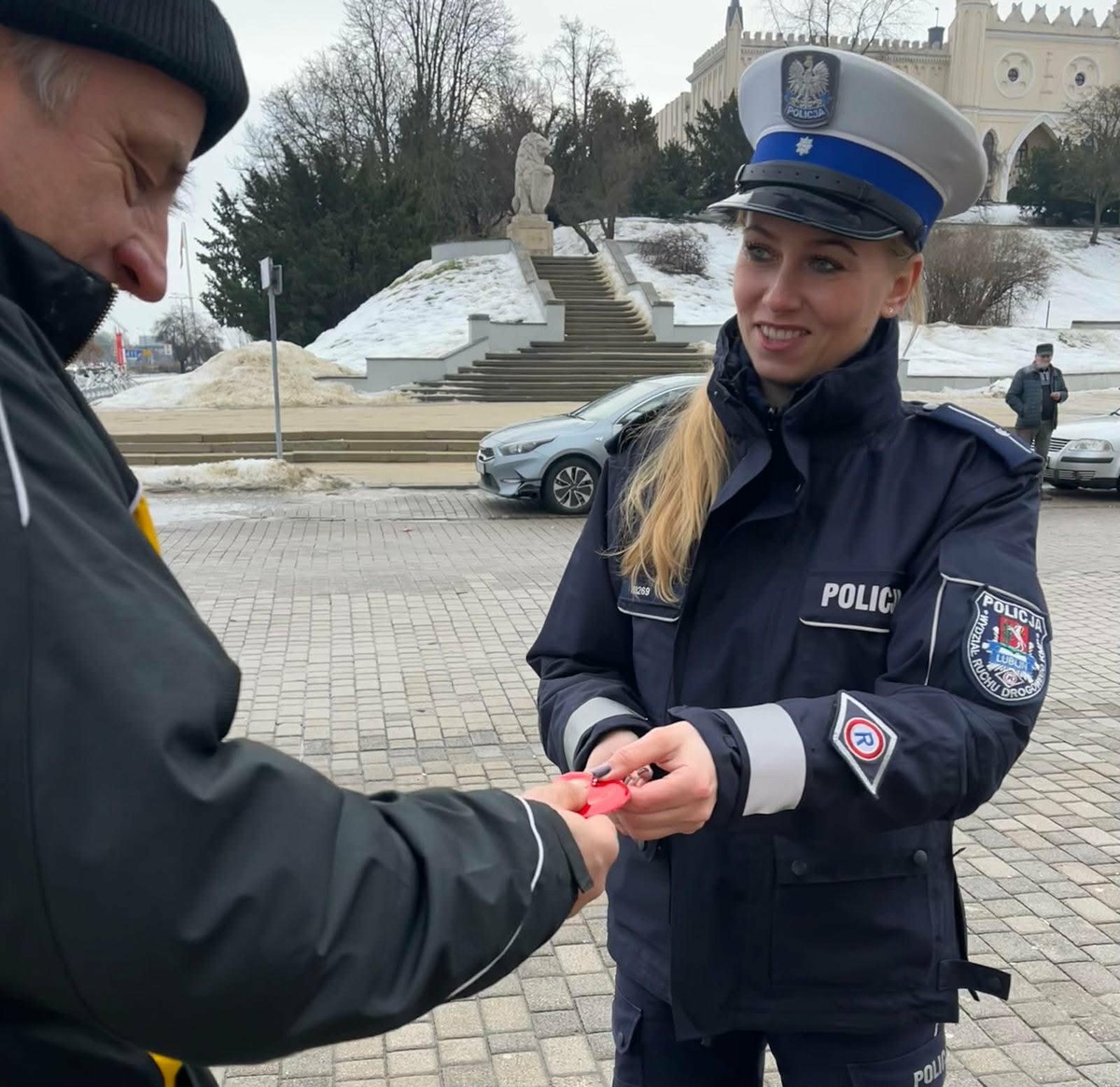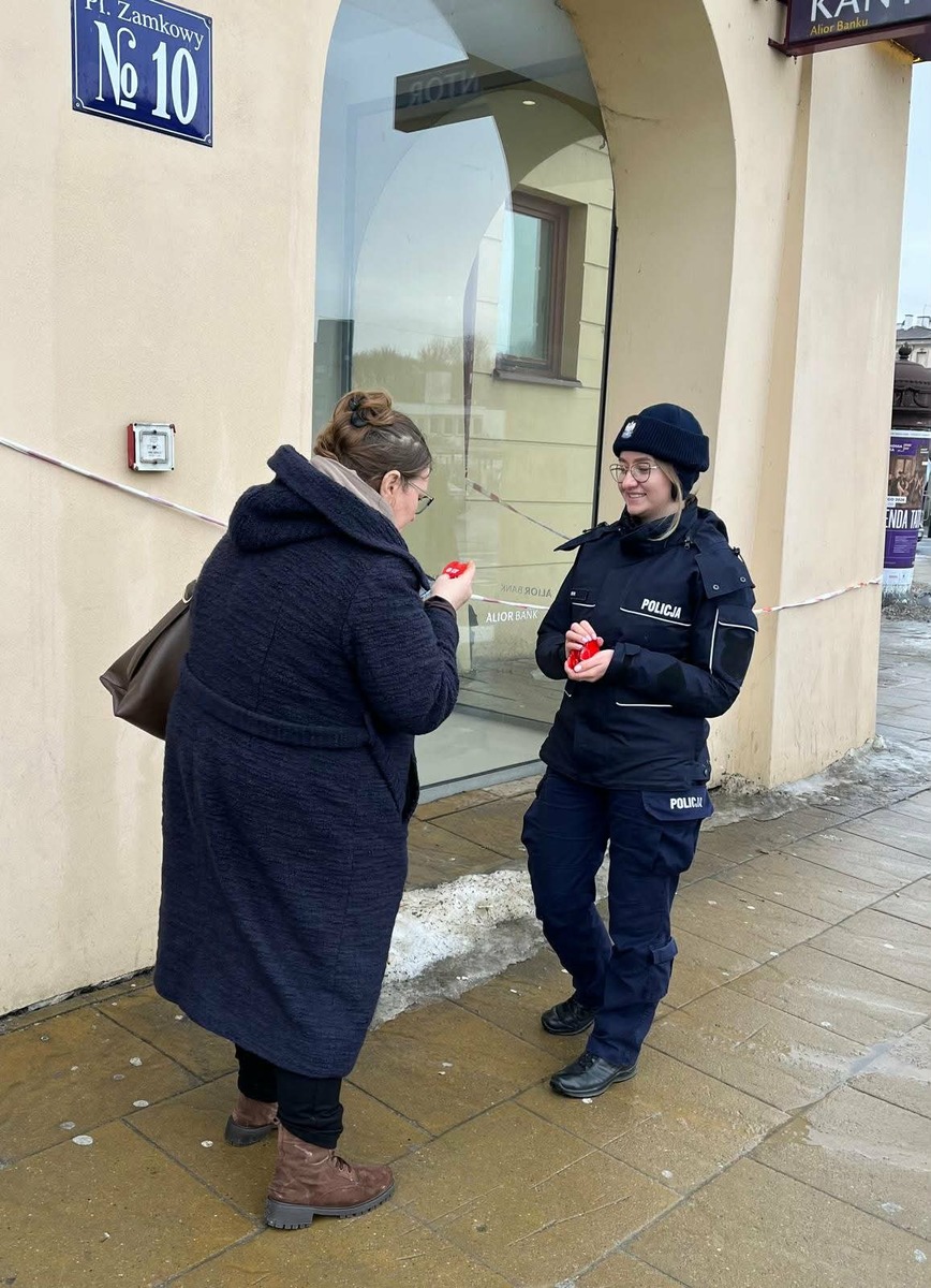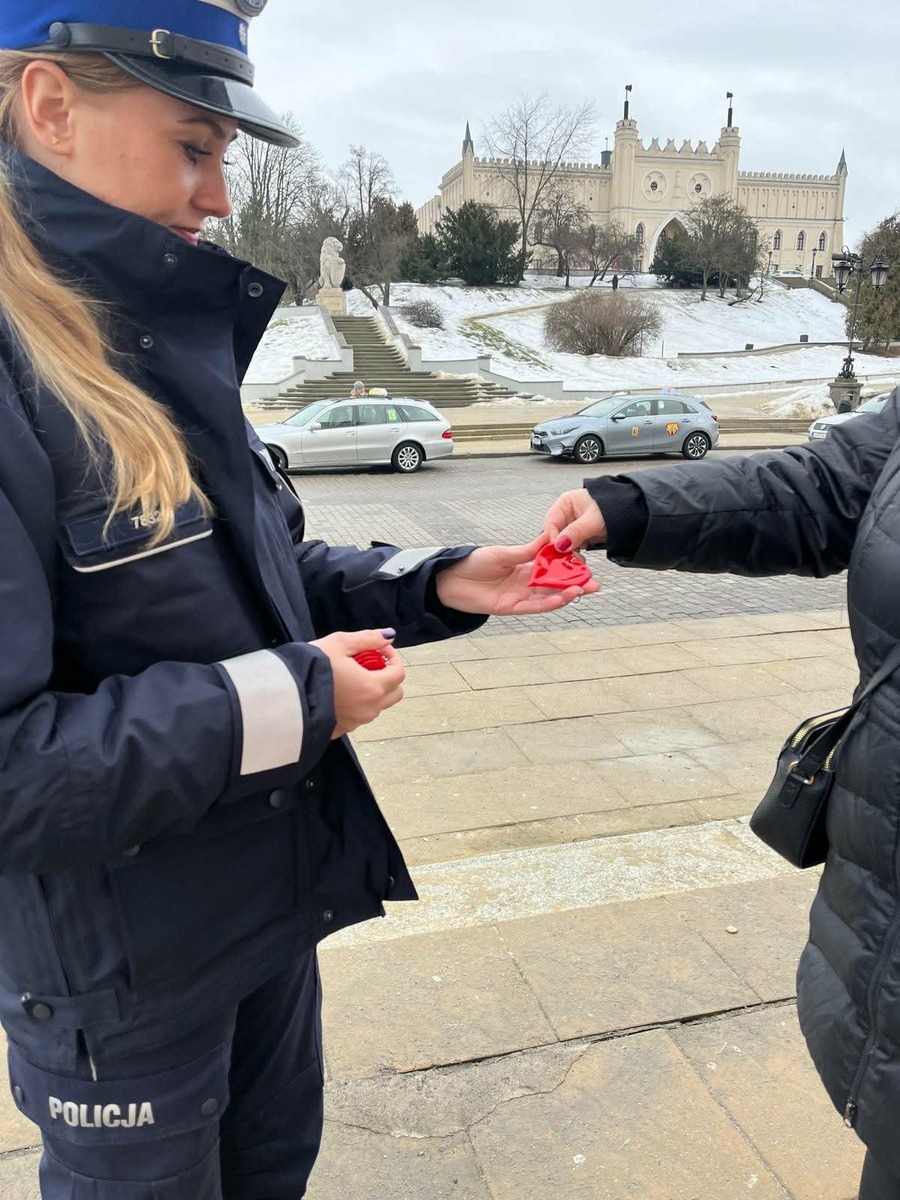 Dziś w centrum Lublina mundurowi z Wydziału Ruchu Drogowego oraz Wydziału Prewencji Komendy Miejskiej Policji w Lublinie przeprowadzili walentynkową akcję prewencyjną pod hasłem „Serce dla bezpieczeństwa”. Funkcjonariusze rozdawali przechodniom odblaski w kształcie serca oraz rozmawiali o tym, jak ważne jest używanie elementów odblaskowych w codziennym poruszaniu się po drogach.