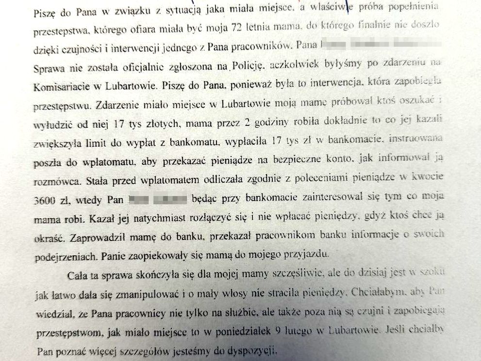W przesłanych do komisariatu podziękowaniach córka kobiety zaznaczyła, że jej mama „do dziś jest w szoku, jak łatwo dała się zmanipulować i o mały włos nie straciła pieniędzy”, a także podkreśliła, że policjanci „nie tylko na służbie, ale także poza nią są czujni i zapobiegają przestępstwom”.